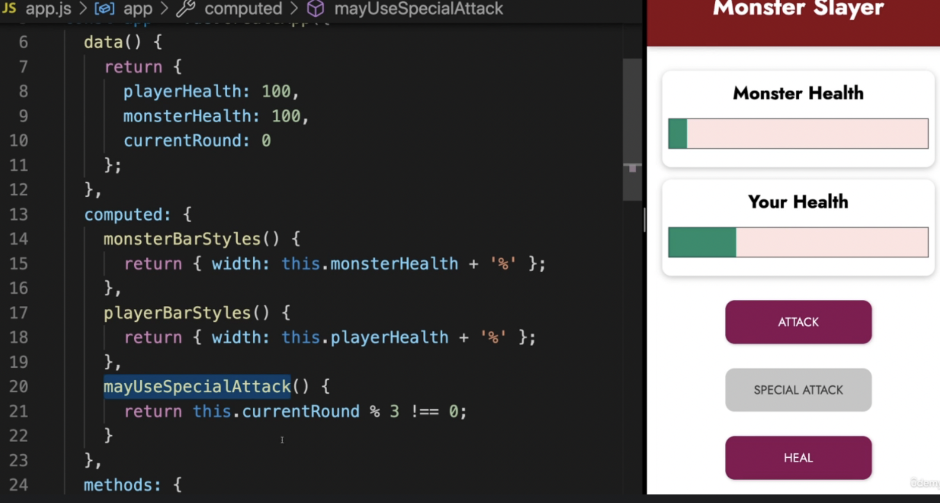 The difference here is that when we use in HTML, we don't have to call the variable with "this", but here in app.js, we should call with "this".